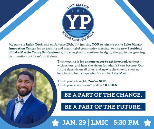 ✨ Be a part of the change. Be a part of the future. ✨ Join Jaden Tuck, President of Lake Martin Young Professionals, for a community meeting centered on connection, leadership, and what’s ahead for Alexander City & Lake Martin. All are welcome — come learn how to get involved and make an impact.Images